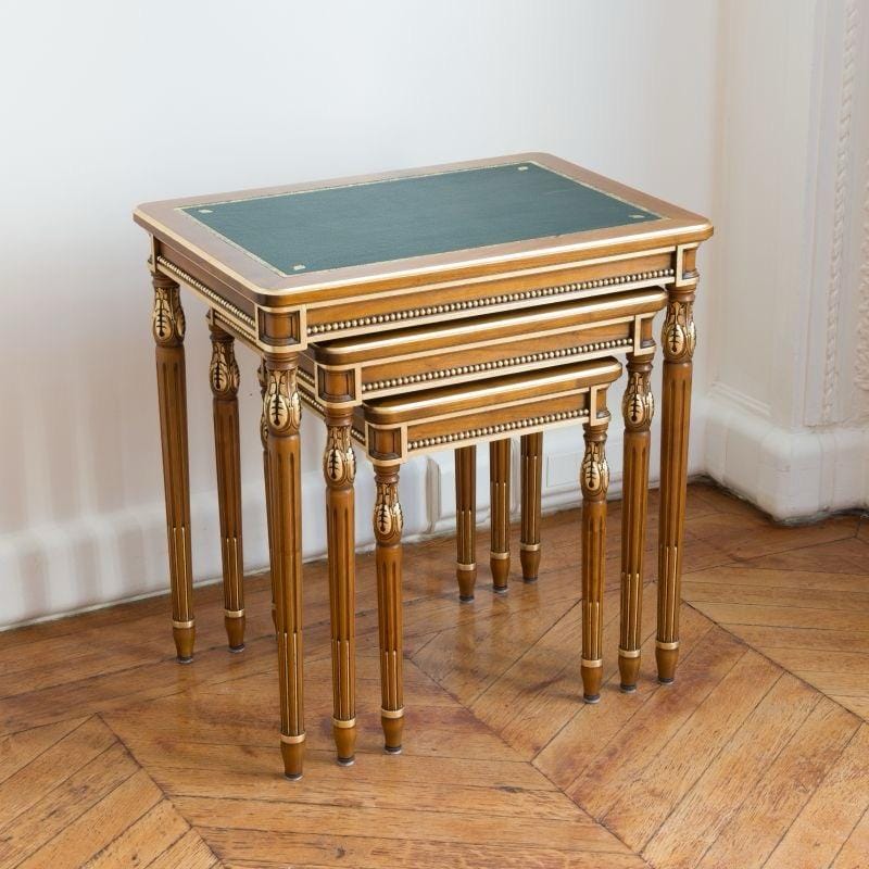 طقم طاولات ثلاثي متداخل يتميز بهيكل خشبي أنيق محفور يدوياً في صورة نقوش أويما فخمة مع طبقة طلاء بلون بيچ، سطح كل طاولة مصقول بطبقة من الرخام الطبيعي بألوان متناغمة لإضافة المزيد من الرقي والصلابة القياسية للطاولات.