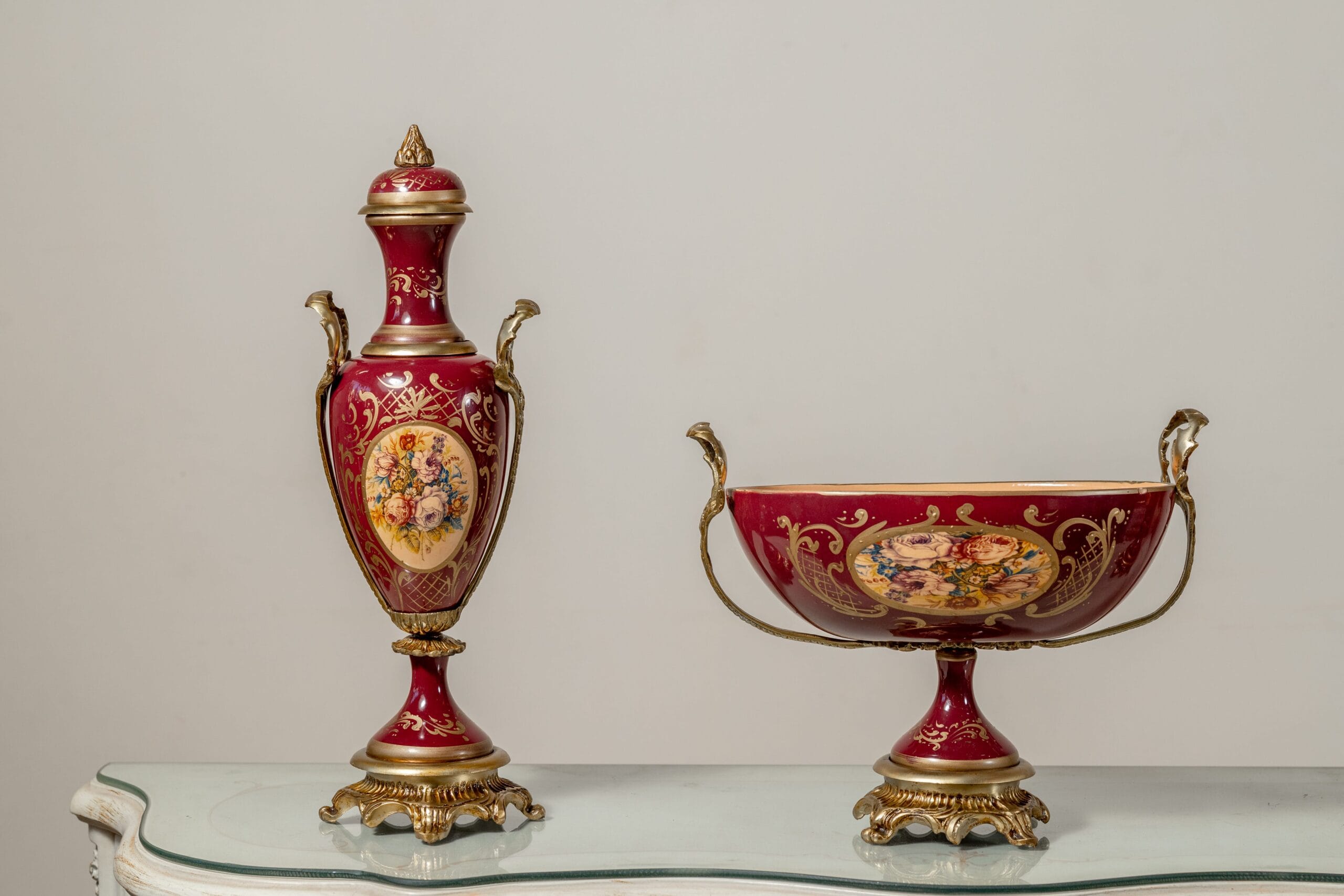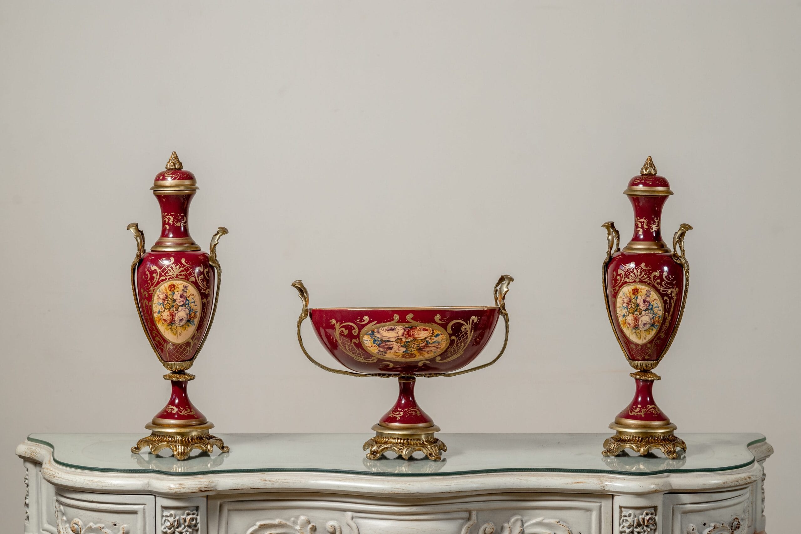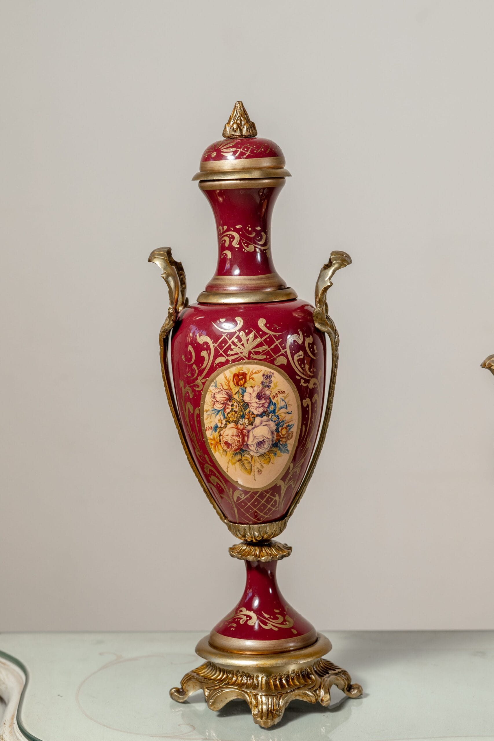 فازة سيفر بطراز تصميم فرنسي يجمع ما بين أناقة الرقبة الخزفية بطلاء أحمر داكن مُطعم برسم لمنظر طبيعي خلاب، مع بريق الإطار والقاعدة من النحاس المُزخرف يدوياً بلمسات فنية ومهارة عالية تتجسد في نقوش ساحرة بأنماط متنوعة.