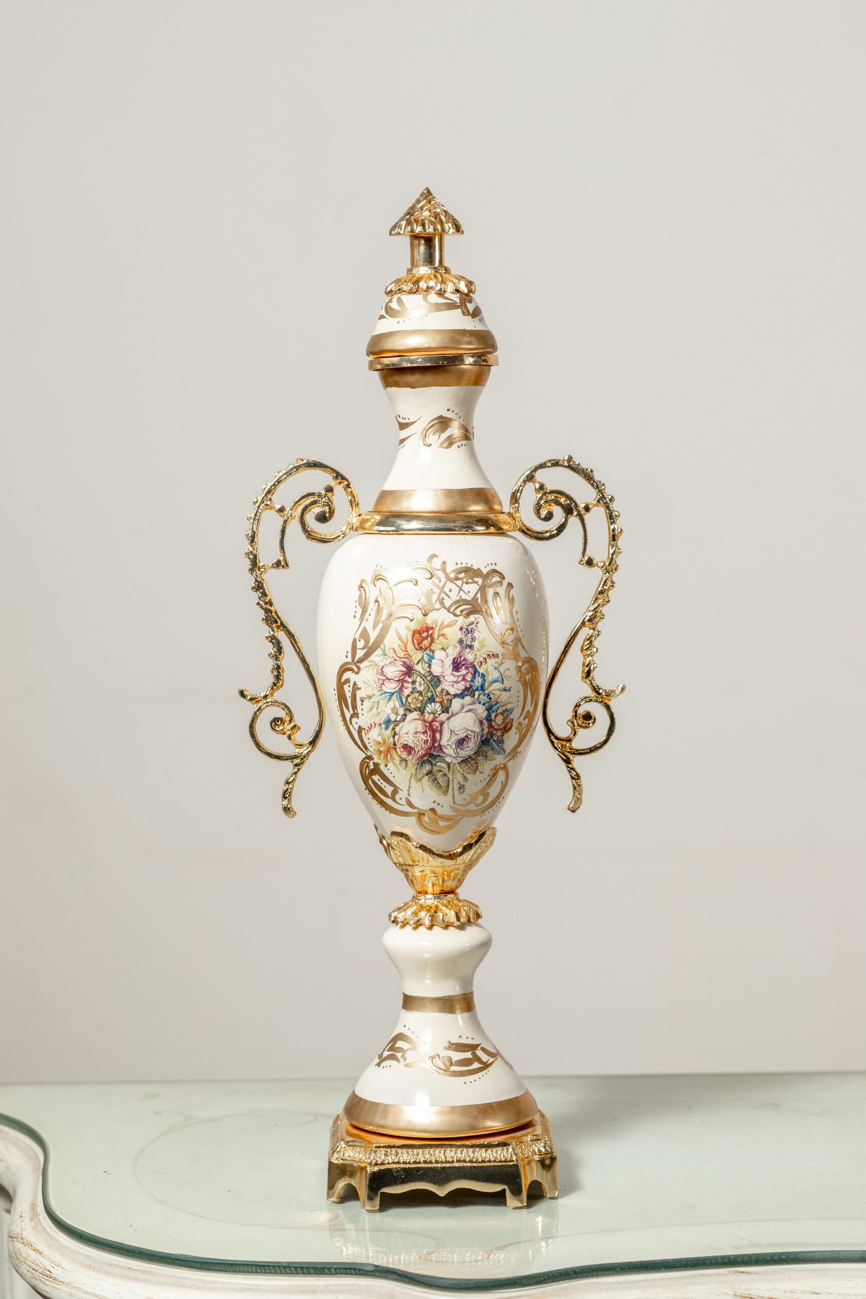 تحفة فنية كلاسيكية مُصممة في هيئة فازة سيفر بطراز فرنسي ذو تفاصيل خاصة (غطاء فخم بإطار ثنائي من النحاس مع زخارف ساحرة على شكل أوراق شجر – رقبة خزفية بطبقة طلاء كحلي مع رسم طبيعي لأزهار غني بالألوان المبهجة – قاعدة صلبة من النحاس المعتّق بزخارف في غاية الجمال).